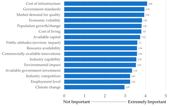 Respondents were asked to consider the importance of a variety of exogenous and endogenous pressures driving innovation in urban development (Figure 3). Overall, the cost of infrastructure was perceived to be the most important (M = 4.08), followed by government standards and regulations (M = 3.95) and market demand for high-quality development (M = 3.94). Climate change was considered least important, but the mean rating still indicated it was moderately important (M = 2.97).
