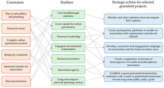This synthesis confirms that while there is clarity about what arrangements are needed for radical innovation in greenfield developments, significant structural and institutional barriers need to be overcome. To that end, deliberate strategic actions are essential to bridge the gap between recognizing barriers and enablers and activating greenfields to achieve tangible systemic change. Without a clear and coordinated pathway forward, industry actors risk remaining trapped in a cycle of problem diagnosis without resolution. These strategic actions can act as a bridge between the potential for niche innovations and the entrenched structures of existing regimes, creating conditions that can facilitate transition processes consistent with MLP dynamics [9] and field-level transformations [6].
