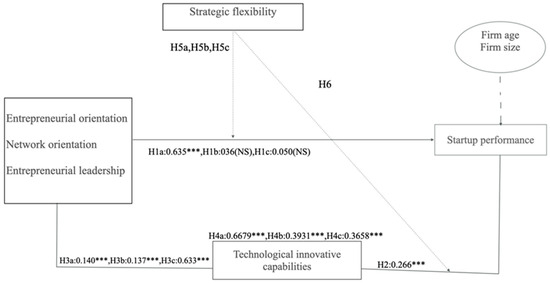 Furthermore, according to Aftab et al. [4], startups usually have a lower absorptive capacity than established businesses, which restricts their potential to incorporate outside resources for long-term growth. This is addressed by strategic flexibility, which improves the connection between startup performance and network orientation [17,74]. It makes it possible for new businesses to effectively integrate and use outside resources, increasing resource efficiency and cutting expenses [31]. Additionally, by speeding up the transformation process, strategic flexibility lowers the time and expense involved in resource integration. More strategic flexibility makes startups more likely to grow their external network connections, which improves their overall performance [75]. Building on this conceptual foundation, the following hypotheses are formulated: