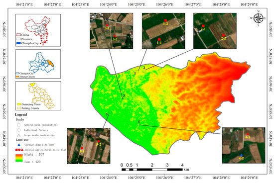 First, we selected Jintang County as a representative agricultural county. Jintang, located in the central region of the fertile Chengdu Plain, is one of China’s first designated commodity grain bases, and it has a long history of cultivation. It serves as a secondary vegetable production base for the provincial capital, generating nearly RMB 300 million from vegetable farming. Jintang was assessed as having the highest cultivated land productivity among the counties of Chengdu [29], and plastic mulching is widely used to enhance crop production and suppress weeds. Therefore, Jintang County may represent the region most significantly impacted by microplastic pollution in agricultural soils in Sichuan Province.