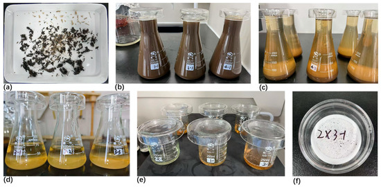 Materials retained on the sieve were washed with HCl to remove ZnCl2, followed by rinsing with distilled water until a pH of 7 was reached, as verified by a pH test strip. The washed materials were then flushed into a 250 mL breaker using distilled water. As shown in Figure 2e, approximately 20 mL of 30% H2O2 solution and 10 mL of FeSO₄ were added to digest the organic matter. Digestion was carried out at 40 °C for 48 h, with distilled water added during the first 30 min, if needed, to prevent vigorous boiling. Throughout the digestion process, H2O2 was supplemented as necessary based on the soil organic matter (SOM) level of the sample. After digestion, the solution was filtered through the sieve again, and the retained materials were first rinsed with HCl before being flushed down with ZnCl2 into 100 mL Erlenmeyer flasks. As the materials’ densities would change again, the MPs and unwanted impurities could be further separated in a final flotation. The supernatant was then vacuum-filtered, and the extracted microplastics were collected onto an MCE membrane, as shown in Figure 2f.