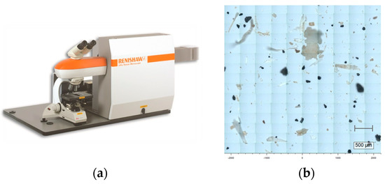 (a) Renishaw inVia™ confocal Raman microspectroscope; (b) a 4 mm × 4 mm square scanned under a 20× objective lens. In (b), the black particles were mostly carbon, and the yellow particles were SOM or oxidized MPs.