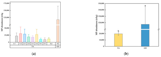 The abundances (a) of the sampling sites (b), as grouped by land-use type, where TA refers to typical agriculture and GD to garbage dump, and different lowercase letters above the columns indicate statistically significant differences (p < 0.05).