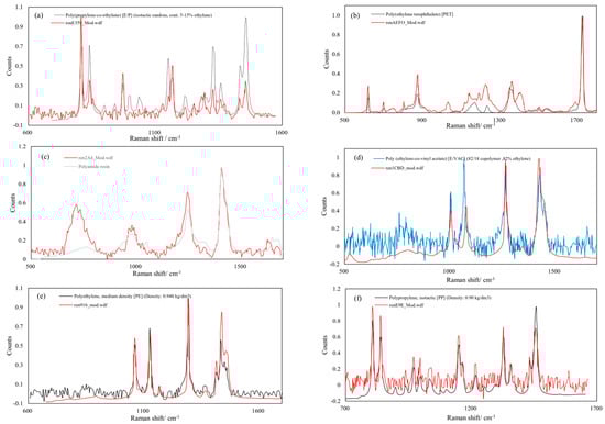 Fingerprint region of the Raman spectra of the (a) E/P, (b) PET, (c) PA, (d) EVA, (e) PE, and (f) PP obtained from the soil MPs extracted in this study. The red line represents the raw/smoothed spectrum of the MPs in the sample, while the black line represents the spectrum of the standard polymer.