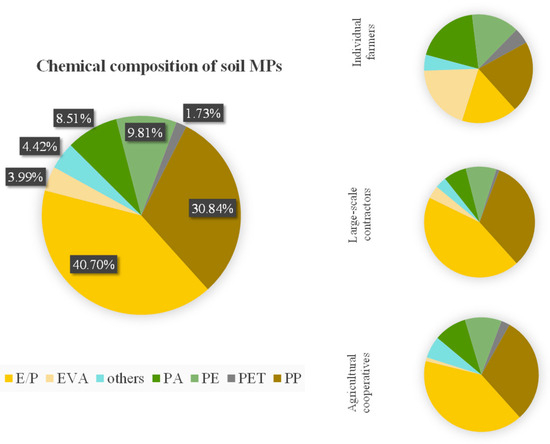The top three most abundant polymer types identified in the MP samples were E/P, PP, and PE, which accounted for more than 80% of the total. These were followed by PA, EVA, and PET. Figure 6 shows the fingerprint region of the MPs identified in our samples and the standard polymer spectrum provided by a commercial library. Other polymers, including PPS and PS, were categorized as “the others” for statistical analysis, accounting for 4.42% of the total. Significant variation in the chemical composition of the MPs was observed among the sites of different farming scales (p < 0.05). As shown in Figure 7, Individual farmer sites contained less E/P but more EVA compared to the other two scales, and they also had a higher proportion of PA than large-scale contractor sites (Figure 8, Figure 9 and Figure 10).