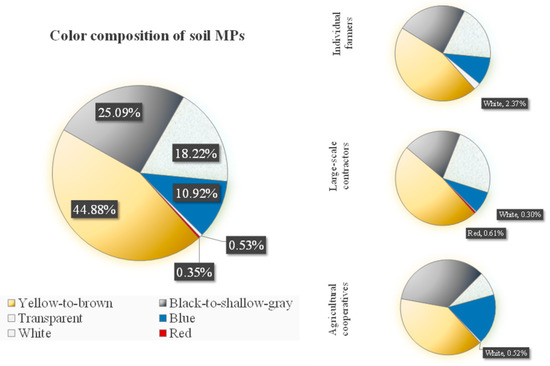 Color compositions of the soil MPs. Significant variation was found across the farming scales (p < 0.05).