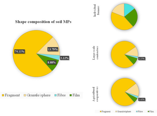 Shape compositions of the soil MPs. Significant variation was found across the farming scales (p < 0.05).