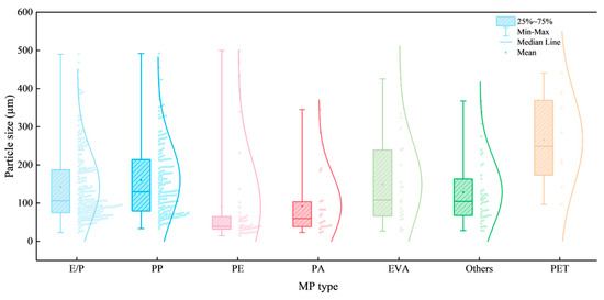 Size distribution of the MPs of different polymer types. This plot includes particles smaller than 500 µm, which equal to 91.23% of the total.
