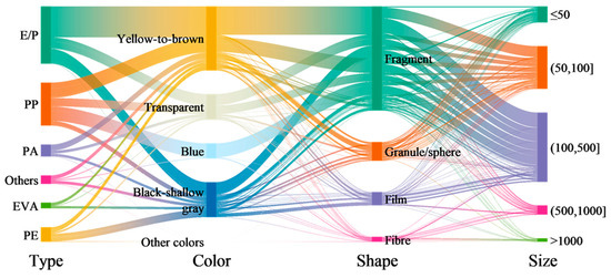 We recorded the physical characteristics of each microplastic (MP), categorizing them into four shapes (fragment, granule/sphere, film, and fiber) and seven colors (yellow-to-brown, gray, blue, black, white, red, and transparent). We also measured their sizes using coordinate data. As shown in Figure 8, colors were primarily yellow-to-brown (44.84%) and black gray (24.78%), with transparent (18.58%) and blue (10.92%) MPs also prevalent. As shown in Figure 9, fragments dominated (74.11%), followed by granules/spheres (13.79%). As shown in Figure 10, soil microplastics (MPs) of all polymer types exhibited a size distribution skewed toward smaller particle, a pattern also found in previous studies (Table 1). MPs size averaged at 346.84 μm, and as shown in Figure 11, over 90% of MPs were <500 μm, Chi-square tests revealed significant color/shape variations across the farming scales (p < 0.05). Although the size distribution variations among the different scales were not significant, they were significant among polymer types (p < 0.05). The distribution of soil microplastics (MPs) across distinct characteristic categories was mapped in Figure 12.