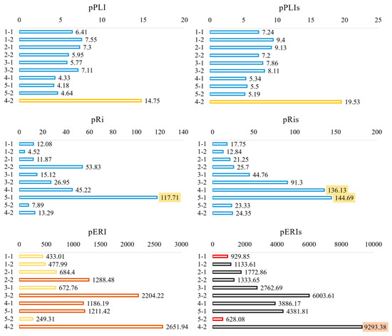 Six risk indices—pPLI, pRi, pERI, and their size-inclusive counterparts—were classified using hazard level criteria [26]. Ecological risk assessments were focused on the MPs of E/P, PP, PE, EVA, PET, PA, PPS, and PS; less common MPs were excluded due to insufficient toxicity data. From the formulas of these indices, it could be seen that the physical meaning were MP abundances (pPLI); the polymer compositions in MP and the monomers’ toxicities of these polymers (pRi); and the integration of MP abundances, polymer compositions, and the monomers’ toxicities (pERI). Meanwhile, for pRis, pPLIs, pERIs, and their size-exclusive counterparts, further accounted risk variation were caused by size distribution.