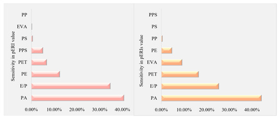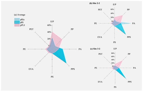 We also conducted an analysis over the contribution from the polymer types to the risk index values. It was revealed that even trace quantities of high-toxicity polymers (e.g., PA and PPS) disproportionately increased the risks. As shown in Figure 17a, where the PPS contributed just over 2% to the average of abundance-based pPLI, contributed nearly half to the average pRi and pRis. The small pink area in the radar chart contrasts sharply with the large blue area, highlighting this disparity in contribution. PA contribution could also be seen in the size-inclusion effect on the index values as it tended to degrade into smaller particles, as has been previously analyzed. The pERI value was also affected by PA occurrence. As shown in Figure 15b, Plot 3, Plot 4, and Site 5-1, which contained a greater abundance in PA MPs, also experienced a stronger size-rescaling effect and exhibited a larger increase from pERI to pERIs.