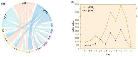 The sequential integration of the MP abundances, chemical composition, and monomer toxicity in the pPLI, pRi, and pERI indices introduced score disparities, precluding direct numerical comparisons. The spatial distribution of the risks assessed by these three indices could be seen in Figure 15a, and the result of Chi-square test showed that there was significant difference between these distribution patterns. As shown in Figure S4, from pPLI(to pRI and) to pERI, the site contributions varied: unchanged for Sites 2-2, 3-1, and 4-1; fluctuated for Site 5-1; increased for Site 3-2; and decreased for Sites 1-1, 1-2, and 5-2. The “size coefficient” that was calculated for , , and was clustered near 1, enabling a value comparison for the size-inclusive and size-exclusive index results. Size-inclusive improved the index values (Figure 15b), and as seen in Figure 16, the paired t-test analysis confirmed that such increases reached significance for pERI (p < 0.05), highlighting the risk originating from smaller particles.