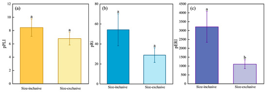 Results of t-test comparison for the size-inclusive and size-exclusive indices for (a) pPLI, (b) pRi, and (c) pERI. Different lowercase letters above the columns indicate statistically significant differences (p < 0.05).