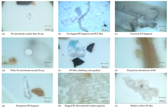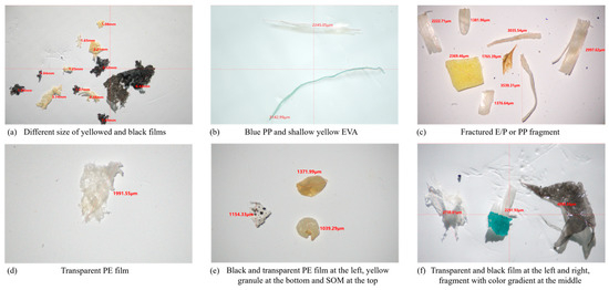 Regarding morphology, black and white MPs—which were likely derived from on-site mulching films, with color choice (black for soil warming and white for cooling)—are tailored to crop needs [61]. The low fibrous MP abundance found contrasts with prior studies, potentially due to vertical mobility [62] and methodological losses (e.g., sieving artifacts from narrow fiber widths). The MPs predominantly displayed weathered morphologies (cracked and rugged) and color gradients (e.g., blue-to-transparent; Figure 18e and Figure 19f), with yellow/gray hues and opacity linked to environmental oxidation [63]. This pattern reflected conventional plastics’ non-biodegradability and progressive fragmentation over time [36]. Small size dominance also indicated that higher MP abundances may be due to prolonged degradation rather than mulching intensity.