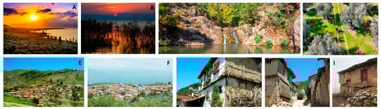Natural and cultural values in the İznik countryside: (A,B) natural values (Iznik Lake); (C) natural values in the Iznik countryside; (D) olive garden in the Iznik countryside; (E,F) settlements in Iznik rural areas; (G–I) traditional houses in the Iznik rural areas.