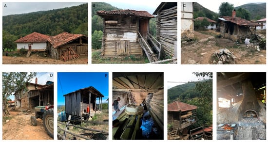One of the most significant features of rural architecture is its adaptation to economic activities. The variations in economic activities are particularly reflected in the extensions of rural houses; indeed, these extensions are key elements that give a dwelling its rural character [74]. In Iznik’s rural areas, various architectural extensions, such as workshops, storage areas, oil mills, mills, barns, haylofts, ovens, garages, and sheds, demonstrate different architectural characteristics and are also regarded as part of the rural industrial architectural heritage (Figure 5). The way these structures and their extensions are arranged and integrated into the landscape in rural settlements creates interesting clusters and patterns. In livestock-oriented areas, barns and haylofts are often placed within a few meters of the residence and arranged adjacently, while in agricultural areas, storage spaces for surplus produce or agricultural equipment are commonly found on the ground floor of homes, as annexes with wooden sheds, or as separate buildings located close to the residence. In addition to these extensions tailored to economic activities, items like tractors parked in village streets or residential gardens, long wooden ladders used during harvest seasons to reach trees, and outdoor ovens attached to homes or placed in gardens contribute to the unique character of rural architecture. Beyond these dwelling and production-related structures, key communal spaces, such as village mosques, coffee houses, and the village headman’s office, typically located in areas that serve as village squares, are essential rural gathering spots used by residents in daily life.