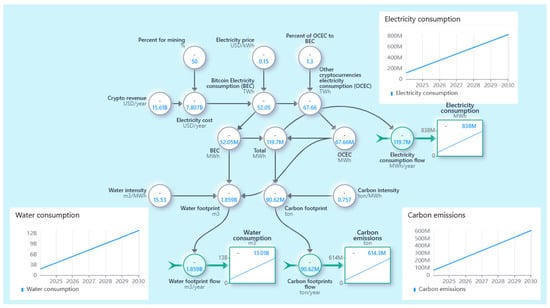 This study’s aim is to investigate the environmental consequences of cryptocurrencies through systems thinking and system dynamics methodologies. The research revealed significant negative environmental implications associated with cryptocurrency mining. In 2023, cryptocurrency consumed 1859 × 106 m3 of water and emitted 90.6 × 106 tons of CO2e, resulting in 119.7 × 106 MWh of electricity consumption.