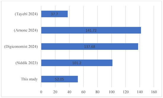 Figure 2 and Figure 3 offer a comparative overview of our study’s findings in relation to other studies. Figure 2 specifically delves into studies focused on investigating Bitcoin’s electricity consumption. For example, ref. [1] reported 101.2 TWh, while refs. [18,29] (representing some of the most cited studies) reported electricity consumption figures of 137.63 TWh and 141.72 TWh, respectively. In contrast, ref. [30] estimated it at 4.3 GW (equivalent to 37.7 TWh). Notably, a noticeable discrepancy exists between the findings of these studies and our current study. We attribute this inconsistency to several factors. Most of these studies rely on an underestimated electricity price assumption, such as the studies by refs. [18,29], where it is assumed to be USD 0.05/KWh, leading to an overestimation of electricity consumption, as depicted in the figure. Additionally, the methodologies employed in other studies ([1,30]) lack clarity, particularly in utilizing market share to estimate electricity consumption. Moreover, certain studies, like ref. [1], employ a carbon density aligned with oil, whereas the majority of power stations globally rely on coal and natural gas. This discrepancy significantly impacts the accuracy and relevance of their findings.