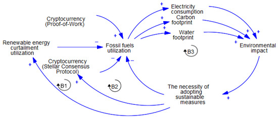In Figure 4, we observe the presence of three balancing loops, which are feedback mechanisms aimed at maintaining equilibrium within a system. Balancing loops counteract changes and stabilize the system. Loop B1 illustrates the inter-relationships among several variables: renewable energy (RE) curtailment utilization, fossil fuel utilization, environmental impact, and the necessity of adopting sustainable measures. This loop suggests that as RE curtailment utilization increases, there is a corresponding decrease in fossil fuel utilization, leading to a reduction in environmental impact. Loop B2 emphasizes the links between cryptocurrency mining, the Stellar Consensus Protocol (SCP), fossil fuel use, environmental impact, and implementing sustainable measures. Adopting a more energy-efficient protocol like SCP reduces fossil fuel use and its environmental impact. Loop B3 examines the relationship between fossil fuel use, environmental damage, and implementing sustainable measures. This loop emphasizes the direct impact of fossil fuel use on environmental degradation and the importance of practicing sustainable measures.