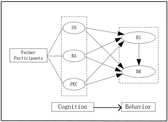 To systematically analyze the factors influencing rural residents’ domestic waste classification, we adopt structural equation modeling (SEM) [44]. SEM is a powerful multivariate statistical technique that allows us to model the latent constructs of interest—subjective norms (SNs), behavioral attitudes (BAs), perceived behavioral control (PEC), behavioral intention (BI), and behavioral response (BR)—and the structural pathways among these constructs [45,46]. This approach is especially suitable for testing complex theoretical frameworks such as the Theory of Planned Behavior in the domain of environmental behavior [5]: