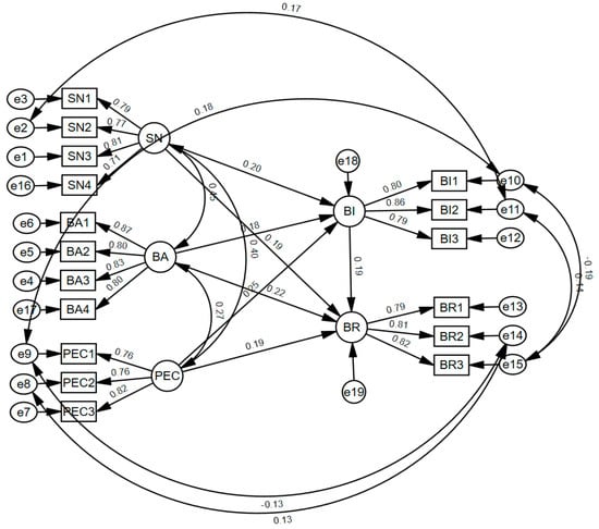 Based on the model hypothesis, measurement index design, and the results of reliability and validity tests, a structural equation model was constructed with SNs, BAs, PEC, BI, and BR as latent variables, as illustrated below (Figure 2). The cognitive–behavioral model of garbage sorting was assessed using AMOS 26.0 software. Given reasonable covariance relationships identified among the variables’ variances, six groups of covariance relationships—e11 vs. e2, e8 vs. e14, e9 vs. e14, e9 vs. e10, e10 vs. e15, and e11 vs. e15—were incorporated based on preliminary results. This approach aimed to reduce the model’s chi-square value without violating theoretical assumptions, thereby enhancing the model’s goodness of fit [44].
