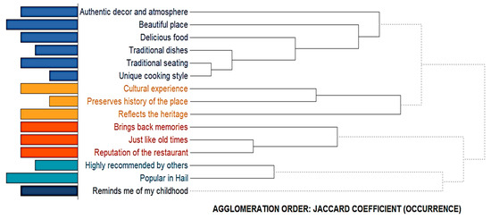 The dendrogram in Figure 3 illustrates the hierarchical clustering of key attributes—mean, median, standard deviation, and coefficient of variation—which represent cultural and gastronomic experiences in heritage restaurants in Hail, KSA. The clustering was determined using the Jaccard coefficient. These are on the left-hand side and grouped by themes, such as ambiance (blue), cultural significance (orange), nostalgia (red), and reputation (cyan). The clustering is carried out based on how often phrases occur together; therefore, we have phrases such as ‘Authentic decor and atmosphere’ next to ‘Beautiful place’ in the same cluster, as well as ‘Delicious food’. In the same manner, phrases such as “Cultural experience”, and “Preserves history of the place” are framed, which also come under the same context of heritage. The phrases “brings back memories” and “just like old times” highlight end users being familiar with the product, while “reputation of the restaurant” and “highly recommended by others” portray social proof. Understanding the agglomeration structure is useful to see how these themes intersect to explain the consumers’ perceptions and behavioral intentions towards gastronomic experiences.