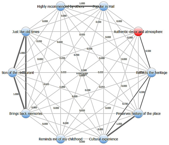 Figure 4 shows the network map of the important parameters associated with heritage restaurants’ gastronomes and cultural offering, for which the connection strength is based on correlation coefficients. Ones are specific features and twos are the connections between the ones or the correlation of features, and thicker lines mean higher correlations. Thus, such attributes as, for example, “Highly recommended by others” and “Popular in Hail” are consistent, r = 1.000, and this means that consumers also associate them. As with the other examples, “Preserves history of the place” and “Cultural experience” substantiate a close connection—drawing attention to the cultural value of the experience. On the other hand, the link between “Authentic decor and atmosphere” and the choice of “Reflects the heritage” is not very strong at 0.500, underlining the importance of heritage in culture. This represents connections between attributes and determines which ones are linked with each other, which creates a focus on the importance of cultural, affectionate, and word-of-mouth clusters in understanding the consumer behavioral intentions towards heritage restaurants.