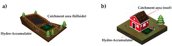 Diagram of the rainwater harvesting systems (RHS) implemented in this study. (a) The Hillside RHS Arauco features a waterproofed catchment area installed on a natural slope, which is connected to a hydro-accumulator. (b) Roof-based RHS in Florida, illustrating the collection of rainfall from rooftop runoff, which is directed through gutters into a storage tank.