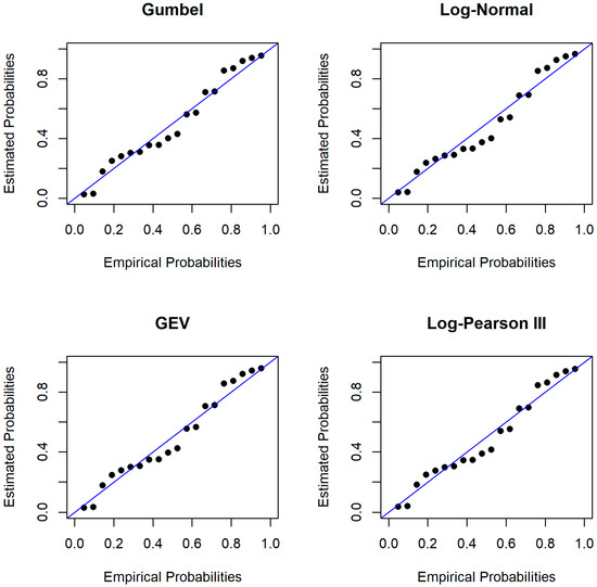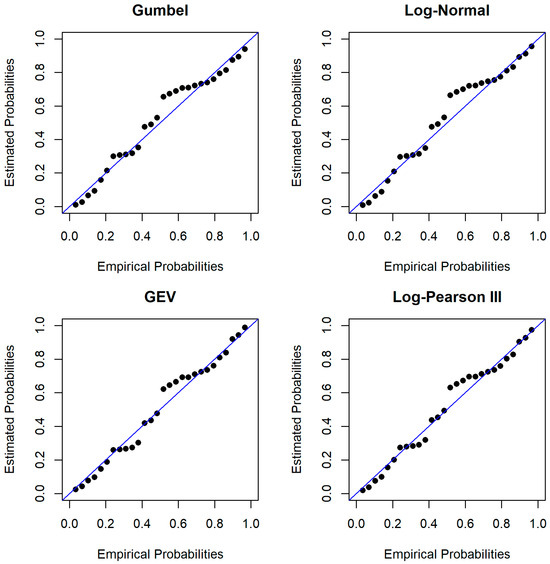 The evaluated CDFs show a good fit for the precipitation data, achieving NSE values above 0.95 and p-values above 0.05 (Table 3) in the Kolmogorov–Smirnov test (i.e., the selected CDFs can be used to model the data). This is further supported by the P-P plots for each CDF (Figure 3 and Figure 4).