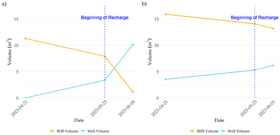 The evaluation of the RHS system was conducted between April and June 2023, during which both the well volume and accumulated volume in the RHS system were recorded. Initially, it was observed that at the commencement of the recharge process, the well volume exhibited an increasing trend, whereas the RHS volume decreased in accordance with the transfer of water to the well (Figure 5).