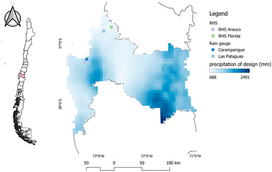 The spatial distribution of the design precipitation in the Biobío region (Figure 6) exhibited significant variability, with values ranging from 688 to 2491 mm year−1. The areas with the highest precipitation (>1000 mm year−1) were primarily located in two sectors: one near the central to southeastern region and another clearly defined in the extreme southeast of the region, both identified as favorable zones for RHS implementation. Conversely, the northern and western areas presented lower precipitation levels, suggesting that these regions might require larger catchment areas or greater storage capacities for efficient rainwater harvesting. Regarding precipitation levels, RHS Arauco (<1300 mm) exhibited higher precipitation than RHS Florida (<1000 mm).