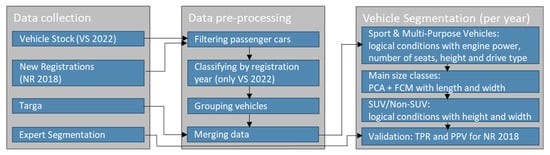 The remainder of the paper is structured as follows: Section 2 describes the materials and methods used in this study, including an overview of the datasets (Section 2.1), the segmentation approach (Section 2.2), and its validation (Section 2.3). Section 3 presents the results of our analysis, including the trends in the composition of the Swiss passenger car fleet (Section 3.1), changes in vehicle dimensions and weight (Section 3.2) and developments in engine characteristics (Section 3.3) and the main electric vehicle powertrains (Section 3.4). Finally, Section 4 provides a discussion of the findings, including a summary of the results, links to external influencing factors, the environmental and public health impacts of the observed trends, and the limitations and outlook of the study.