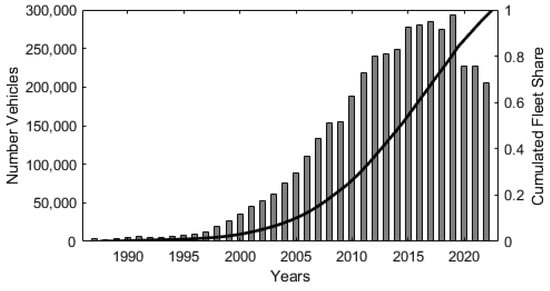 - Vehicle Stock (VS) database: Similar in structure to the NR database, the VS database contains information on all vehicles in circulation throughout Switzerland at the end of the given year. Since annual NR datasets are only available from 2010 onwards, we used the VS 2022 dataset [33], which includes 6,821,551 vehicles, for our temporal analyses. By classifying vehicles based on their first year of registration, we were able to characterize changes in Swiss new vehicle fleets from 1987 to 2022. However, it is important to note that the results for a given year represent only the fraction of registered vehicles that were still in circulation at the end of 2022.