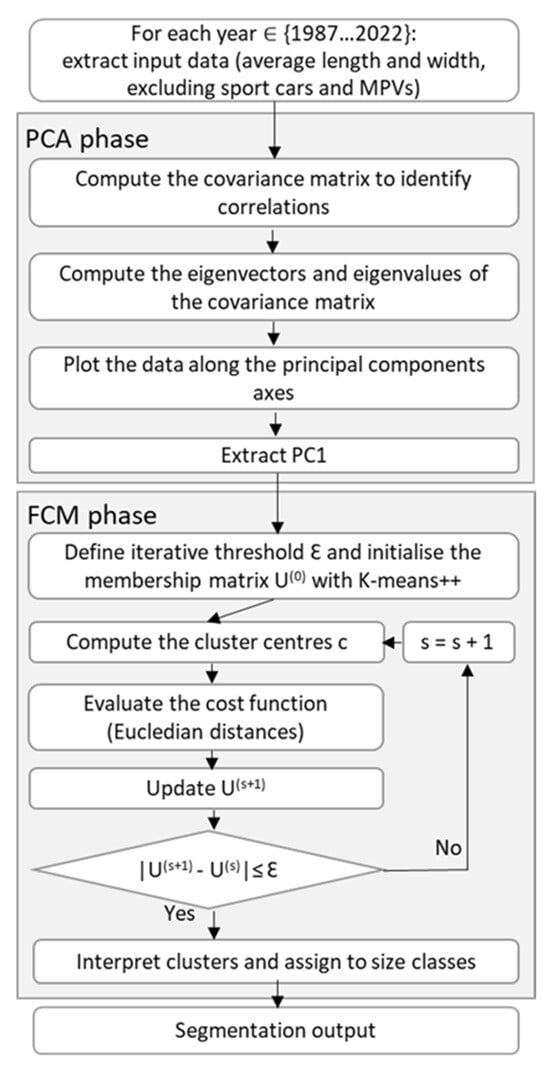 After extracting the sport and multi-purpose vehicles, we segmented the remaining vehicle samples separately for each year in the VS 2022 dataset and for the NR 2018 into five main size categories, following the machine-learning based procedure illustrated in Figure 3. Based on the analysis of the expert segmentation, we identified a strong correlation between vehicle width and length and the five main vehicle classes (see Figure 4a). Consequently, the segmentation was performed using the average vehicle model length and width. To fully capture the dimensional variance of the dataset, we first conducted a PCA for each year. Subsequently, we applied the FCM algorithm to the first principal component (PC1) to determine the cluster memberships for each unique vehicle sample in the given year (see Figure 4b). To enhance the convergence behavior of the algorithm, we used the K-means++ initialization method [37]. Lastly, for each year, the resulting classes were assigned to the five main size classes: micro, small, medium, upper-medium, and large and luxury vehicles. In addition, for the NR 2018 dataset, the resulting clusters were then compared to the expert segmentation for validation purposes, as shown in Figure 4c.