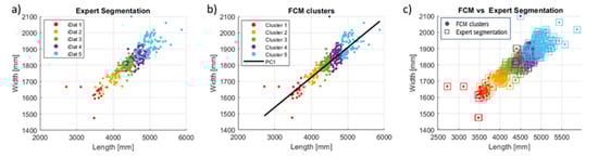 Machine learning-based segmentation of new passenger vehicles registered in Switzerland in 2018 (NR 2018) based on vehicle width and length after excluding sport and multi-purpose vehicles: (a) correlation of expert segmentation of the NR 2018 dataset with vehicle length and width, (b) results of Fuzzy C-Means (FCM) clustering using the first Principal Component (PC1) from Principal Component Analysis (PCA) of vehicle width and length, and (c) comparison of FCM clusters with expert segmentation.
