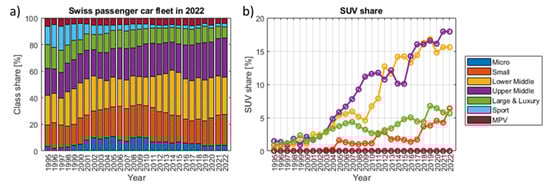 Temporal evolution of vehicle class shares in the Swiss passenger car fleet in 2022 (VS 2022): (a) distribution across seven vehicle main classes, (b) SUV share within each class.