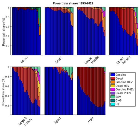 Figure 7 illustrates the temporal evolution of the share of different powertrain types within the various vehicle classes. Since 1995, the share of gasoline vehicles has steadily decreased across all vehicle classes, while the share of diesel vehicles experienced substantial growth in most segments between 1995 and 2017. However, starting in 2017—and accelerating significantly since 2020—there has been a sharp rise in the adoption of alternative powertrains. This trend is particularly evident in electrified vehicles, including BEVs, gasoline HEVs, and gasoline PHEVs, across the micro, small, lower-middle, upper-middle, and large and luxury classes. In the sport class, BEVs and gasoline HEVs have seen a notable increase since 2012 and 2019, respectively, though gasoline remains the dominant powertrain, accounting for over 75% of sport car registrations in 2022. In the multi-purpose vehicle class, diesel remains the most common powertrain, followed by gasoline, accounting for 58% and 28% of registrations in 2022, respectively. While the share of BEVs has been gradually increasing since 2020, and gasoline PHEVs gained some traction in 2022, the overall transition to alternative powertrains in this category has been slower compared to other vehicle classes.