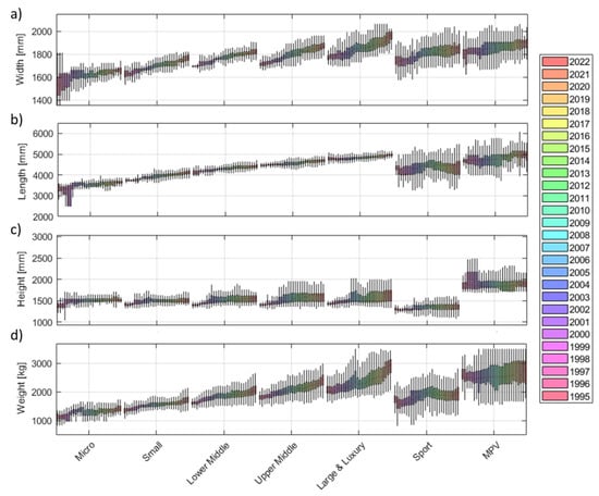 The temporal evolution (from 1995 to 2022) of the main vehicle dimensions and weight in the various vehicle classes based on the Swiss passenger car fleet in 2022 (VS 2022): (a) width, (b) length, (c) height, (d) weight.