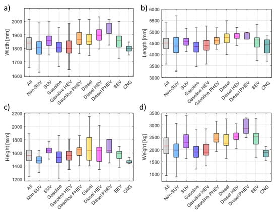 Figure 9 illustrates the variability in vehicle dimensions and weight across different classes and subclasses in 2022, including all vehicles combined, non-SUVs, SUVs, and various powertrain configurations. Hydrogen vehicles are omitted due to their low registration numbers, which lack statistical significance. The analysis highlights that SUVs generally have larger dimensions—especially in height—and greater weight compared to non-SUVs. Notable differences also emerge across powertrains: gasoline, gasoline HEVs, and compressed natural gas (CNG) vehicles tend to be smaller and lighter than the average. BEVs, while of average size, are heavier due to the battery weight. Diesel and diesel HEVs are typically larger and heavier than their gasoline counterparts, exceeding the overall average. In addition, gasoline and diesel PHEVs tend to be larger and heavier than conventional gasoline, diesel, and hybrid vehicles. Gasoline PHEVs exhibit dimensions and weight similar to BEVs, whereas diesel PHEVs are even larger and heavier. This reflects the characteristics of diesel engines, their prevalence in larger vehicle segments, and the added weight of hybrid and plug-in hybrid systems. While diesel PHEVs appear to be the largest and heaviest vehicles in the comparison, their market share remains minimal (as shown in Figure 7), with no significant growth expected in the future.