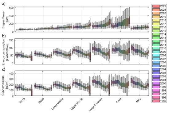 Table 3 presents the percentage changes in engine power, energy consumption, and CO2 emissions since 2000 for the main vehicle classes. Between 2000 and 2020, engine power has increased significantly across all vehicle classes, ranging from 30.5% for multi-purpose vehicles to 97.7% for sport cars. Micro, small, lower-middle, sport and multi-purpose vehicles exhibit a consistent upward trend in energy consumption throughout the analyzed period. In contrast, energy consumption in the upper-middle and large and luxury classes primarily increased between 2010 and 2020. Despite these increases, the median energy consumption and normative CO2 emissions steadily decline across all vehicle classes from 2000 to 2020. Energy consumption reductions range between 17.0% for sports cars to 39.7% for upper-middle cars, leading to a corresponding decrease in normative CO2 emissions between 24.4% for sports cars and 44.2% for upper-middle cars.