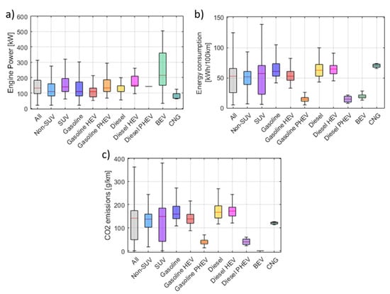 Figure 11 illustrates the variability in engine power, energy consumption, and normative tailpipe CO2 emissions across various vehicle classes and subclasses in 2022, including all vehicles, non-SUVs, SUVs, and different powertrain configurations. As with previous analyses, hydrogen vehicles were excluded due to their low statistical significance. The results show that SUVs and electrified vehicles generally have more powerful engines than non-SUVs and their non-electrified counterparts. As expected, CNG vehicles, primarily found in the small and lower-middle car segments, as shown in Figure 7, exhibit the lowest engine power. In contrast, BEVs have the highest median engine power and the greatest variability, reflecting their presence across all size classes and their significant share in the upper-middle and large and luxury segments in 2022. Regarding energy consumption and normative tailpipe CO2 emissions, no major differences are observed between SUVs and non-SUVs. However, clear distinctions emerge among different powertrains. As expected, PHEVs and BEVs demonstrate significant advantages, with energy consumption reduced to approximately one-third and emissions to one-quarter (PHEVs) or even zero (BEVs) compared to conventional powertrains.