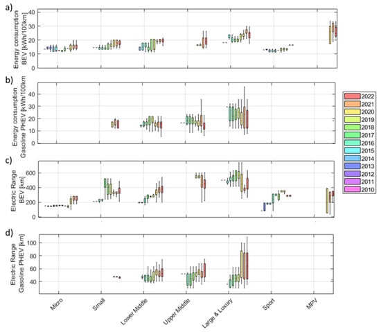 The temporal evolution (from 2010 to 2022) of the energy consumption and electric range of the most relevant electric powertrains (battery electric vehicles (BEVs) and gasoline plug-in hybrid electric vehicles (PHEVs)) in the various vehicle classes based on the Swiss passenger car fleet in 2022 (VS 2022): (a) the energy consumption of BEVs, (b) the energy consumption of gasoline PHEVs, (c) the electric range of BEVs, (d) the electric range of gasoline PHEVs. Note: the transition from NEDC to WLTP testing procedures in 2021.