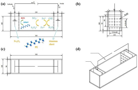Figure 1 presents the orthographic views of the electro-Fenton setup for the degradation of PE MPs. The experimental reactor had dimensions of 350 × 100 × 100 mm and was constructed from acrylic plexiglass. Fe(II) serves as a catalyst to activate H2O2 (electro-Fenton) and persulfate (PS), generating reactive oxygen species (·OH and SO4·−) while undergoing oxidation to Fe(III). Subsequent electrochemical reduction regenerates Fe(II), enabling sustained catalytic activity.