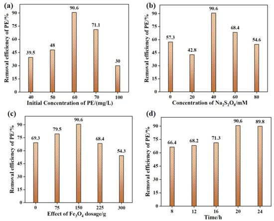 The influence of Fe3O4 dosage on the degradation rate was investigated, as shown in Figure 2c. It was observed that the degradation efficiency of PE MPs reached a maximum of 90.6% when the Fe3O4 dosage was 150 mg. This was attributed to the fact that during the electro-Fenton process, the incorporation of Fe3O4 provided an increased number of reaction sites, thereby facilitating the accelerated generation of two types of radicals (·OH and SO4·−) and the degradation of PE MPs [40]. However, although the number of active sites on the electrode surface increases when the Fe3O4 dosage is increased to a certain extent (225 mg), an excessive number of active sites may obstruct electron transfer on the electrode surface, reducing the reaction rate [41]. Additionally, an excessive amount of electrode material might lead to excessive current density on the electrode surface, causing overheating, corrosion, or detachment of the electrode, ultimately affecting the degradation rate of PE MPs [42]. Hence, the selection of an optimal dosage of Fe3O4 served as a pivotal factor in enhancing the degradation efficiency of PE MPs.
