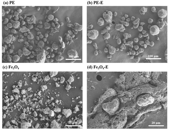 Changes in the physical properties of PE MPs and Fe3O4 before and after electro-Fenton treatment, (a,b) SEM images of original and electro-Fenton-treated PE MPs, and (c,d) SEM images of original and electro-Fenton-treated Fe3O4. In the sample names, the absence of a suffix following PE or Fe3O4 indicates the original sample, while the suffix “-E” denotes the sample after electro-Fenton treatment.