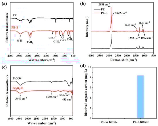 Figure 4c presents the infrared spectra of Fe3O4 and Fe3O4-E. A sharp band at 583 cm−1 and a weaker band at 669 cm−1 were observed, with the positions and shapes of these bands attributed to magnetite [50]. The strong band within the range of 570–585 cm−1 is characteristic of Fe-O absorption, resulting from the symmetric stretching vibration of Fe-O [55]. It was noticeable that the Fe-O peak in Fe3O4-E nearly disappeared, potentially due to substitution by other chemical bonds. Among them, the band at 1630 cm−1 corresponded to the stretching of H-O-H, attributed to the bending of H-O-H from water vapor adsorbed on the surface of magnetite [56]. The band at 3440 cm−1 represented the bending vibration peak of H-O-H [55]. Meanwhile, the aging process was often accompanied by the release of organic compounds, leading to new pollution [57]. To explore the release of organic compounds during the transformation process, PE MPs filtrate with and without electro-Fenton treatment was characterized using TOC. The TOC results (Figure 4d) indicated that compared to the group without electro-Fenton treatment (PE-W filtrate), the group with electro-Fenton treatment (PE-E filtrate) produced significantly more dissolved organic carbon, suggesting that chain scission and reduction of PE MPs occurred during the electro-Fenton process, facilitating the release of organics.