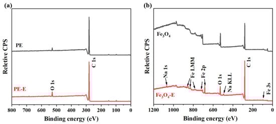 Changes in the chemical properties of PE MPs and Fe3O4 after electro-Fenton treatment, (a) XPS survey spectra of original PE and PE MPs after electro-Fenton treatment, and (b) XPS survey spectra of Fe3O4. In the sample names, the absence of a suffix following PE or Fe3O4 indicates the original sample, while the suffix “-E” denotes the sample after electro-Fenton treatment.