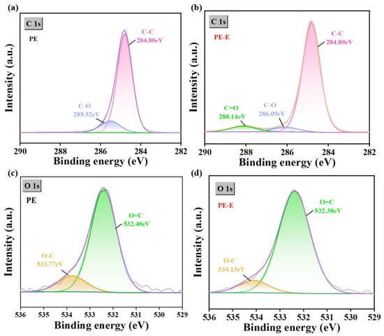 Changes in the chemical properties of PE MPs after electro-Fenton treatment, (a,b) High-resolution X-ray photoelectron spectroscopy (XPS) of the C1s peak for original PE MPs and PE MPs after electro-Fenton treatment, and (c,d) high-resolution XPS of the O1s peak for PE MPs. In the sample names, PE MPs without a suffix represent the original microplastics, while the suffix “-E” denotes the microplastics after electro-Fenton treatment.