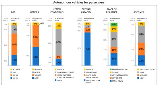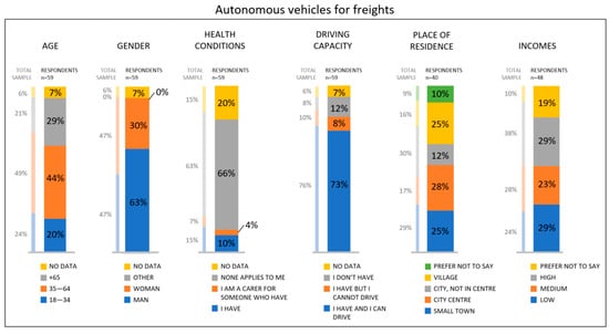 To analyze the relationship between demographic characteristics and perceptions of AVs, the demographic profiles of those suggesting passenger and freight vehicles were compared with the sample as a whole. Six demographic characteristics were included in this analysis, which correspond with the following: