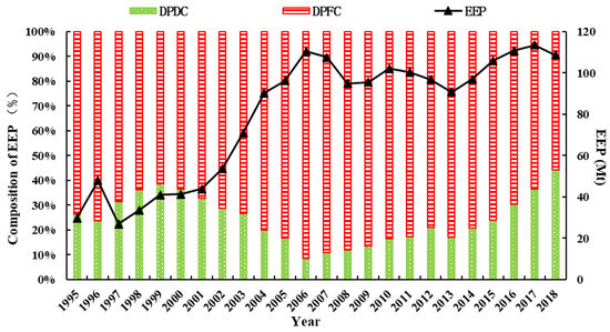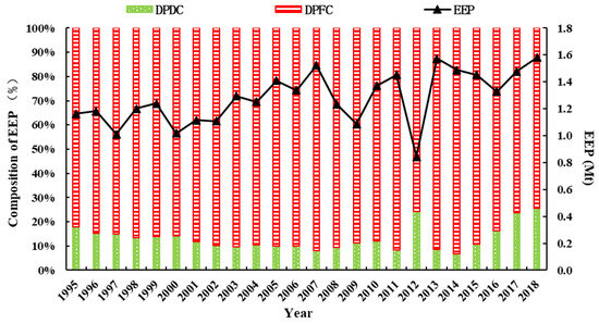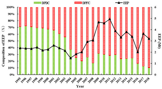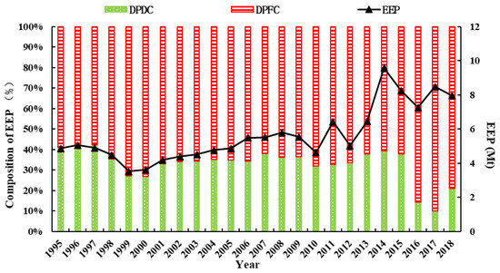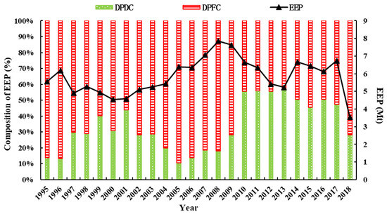 China’s maritime transport industry recorded exceptionally high EEPs of 1,910.35 million tonnes, averaging 79.60 million tonnes annually. DPFCs dominated emissions, contributing 77.08%, while DPDCs accounted for 22.92% (see Figure 4).